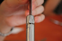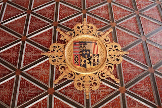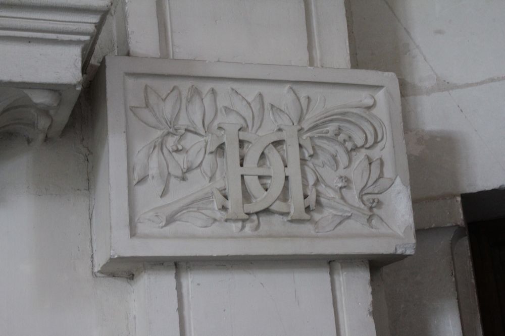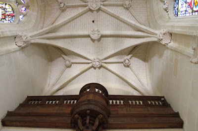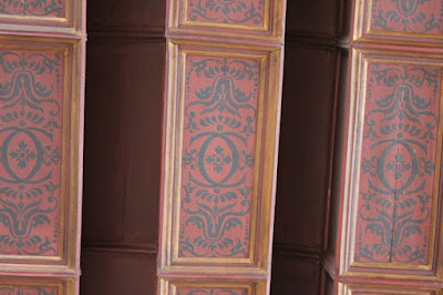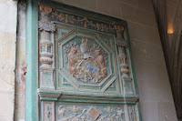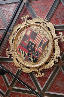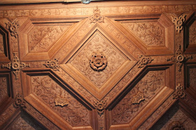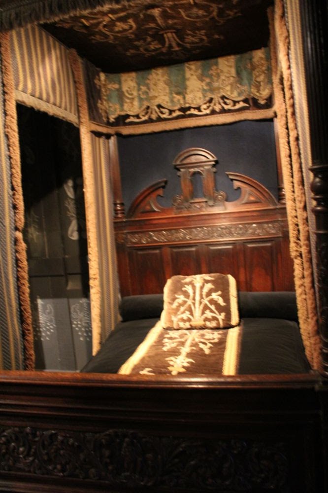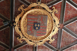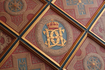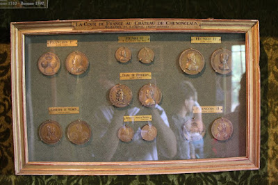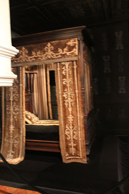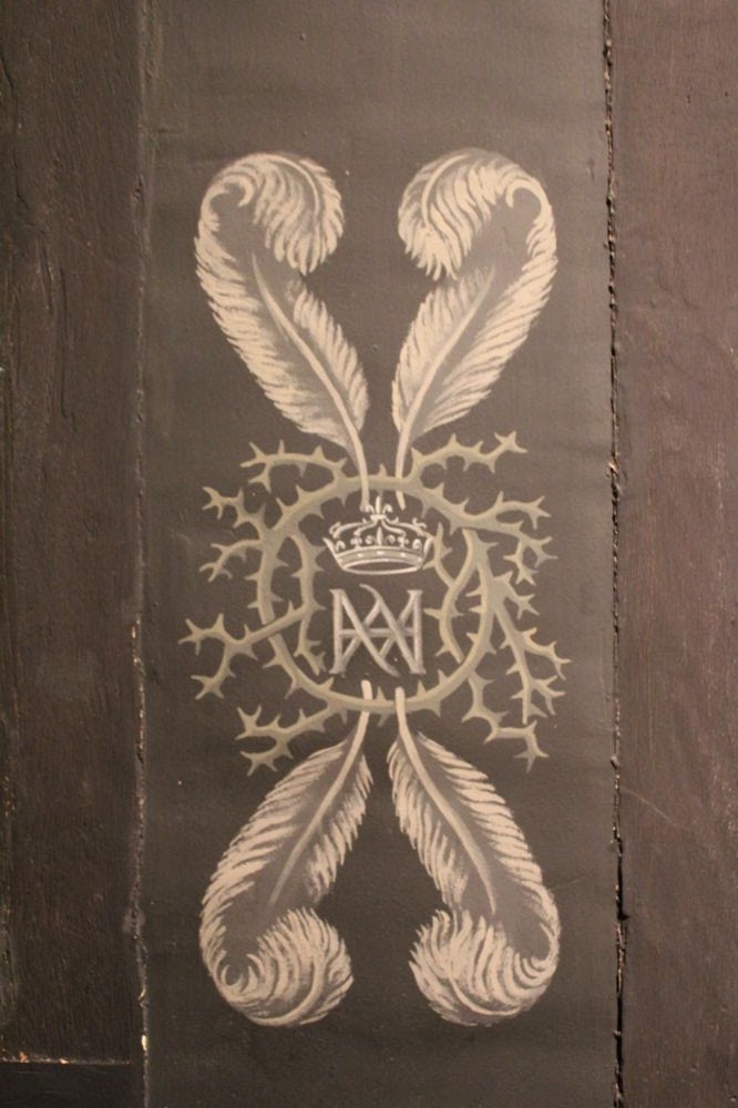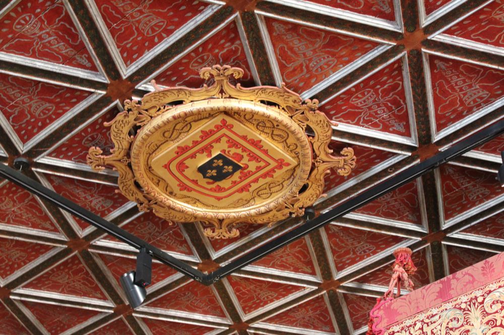 另外一幅畫是法國畫家Pierre Justin Ouvrié的畫作The Château de Chenonceau。 大廳的托樑彩繪也甚為典雅。 三樓只有一間房間可供參觀, 也是小黃對這棟城堡最期待的房間︰露意絲王妃的臥房。 門房上有個老鷹吊環,房裡也是擠滿參觀人潮, 這沒有一絲明亮氣息的房間就是露意絲王妃的臥房。 露意絲在亨利三世被暗 她也按照皇室規範穿起白色喪衣,因此得到白色皇后這個稱號, 終其一身她就這樣渡過了。 房裡把窗簾拉起因此更顯悲戚, 牆壁、天花板都是黑的,以及象徵哀 銀色淚珠、