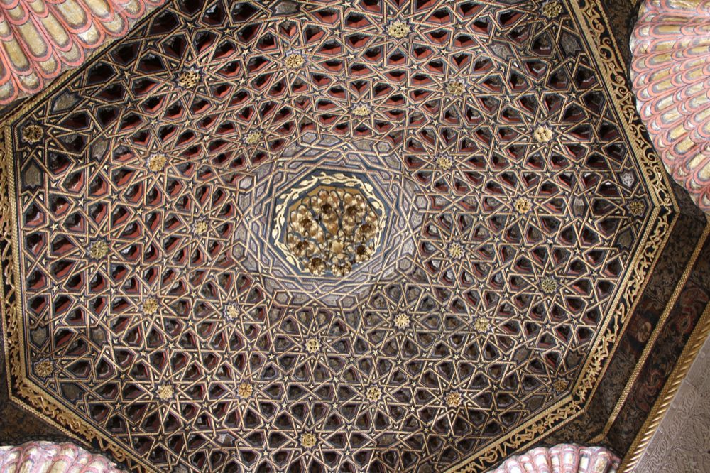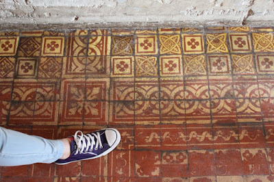 地板是由石灰華與板岩瓷磚所鋪製,天花板由顯露的托樑構成。