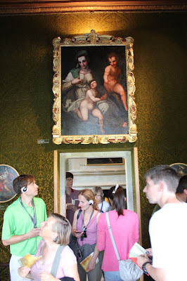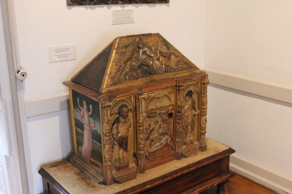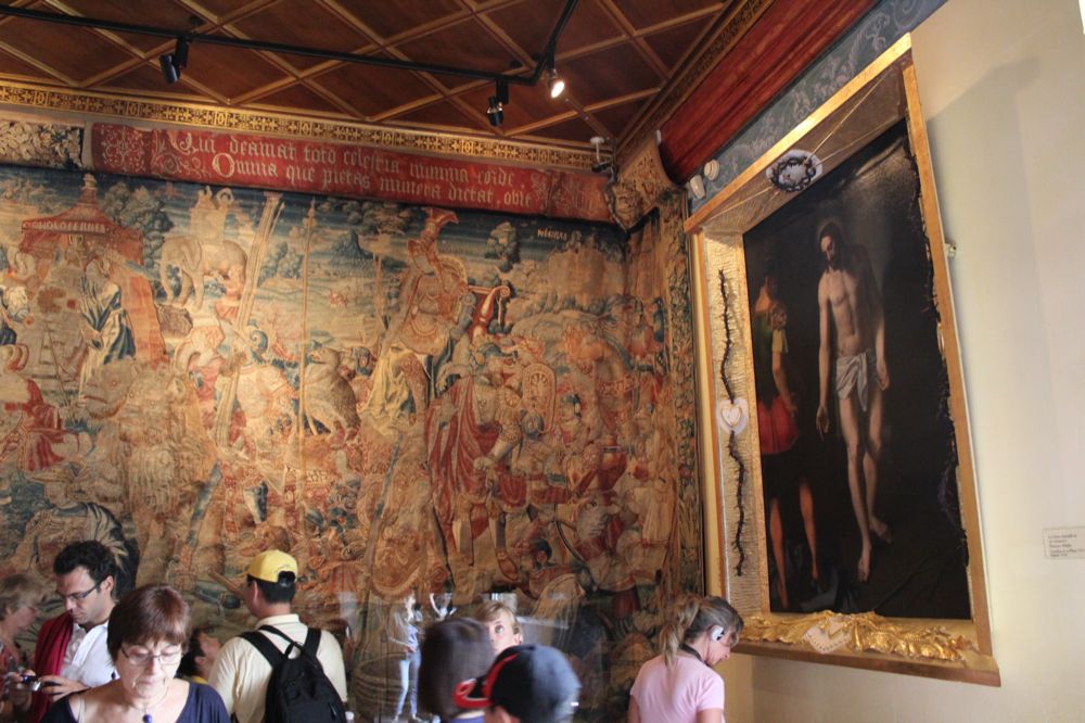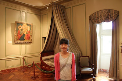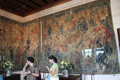 壁爐的左邊是一扇大窗,裝框上還有女神 一旁的金框鏡子也是一絕。 隔壁房間則是嘉布麗埃爾的臥房, 華麗的大床、裸樑天花板、壁爐與傢具都是文藝復興時期的作品。 床邊有一幅16世紀弗蘭德壁毯, 其他三面牆上更掛有罕見的織錦畫The Lucas Months,分別是June、July和August。
