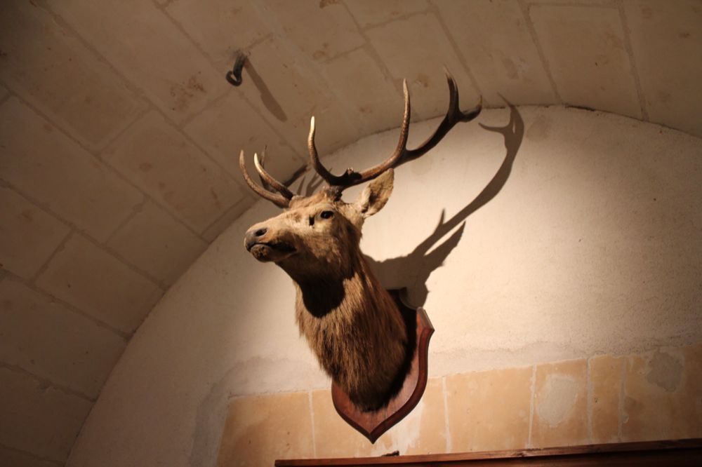 天花板掛著天平,桌上還有些鍋具與杵缽,牆上展示著鹿頭。