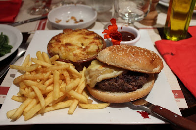 最後姐姐硬是點了果汁給我和小黃喝。 小黃的主菜是牛肉漢堡,還可以點三樣配菜, 其中一項是吃不完的四季豆山。