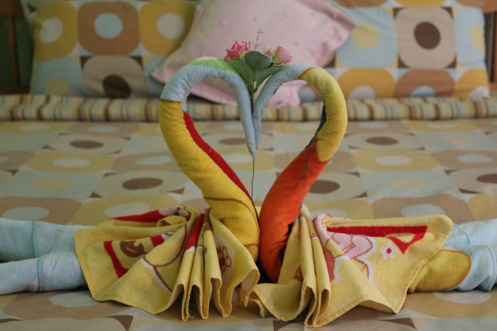 還有摺愛心浴巾在床上