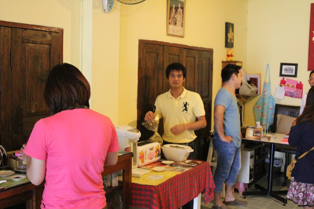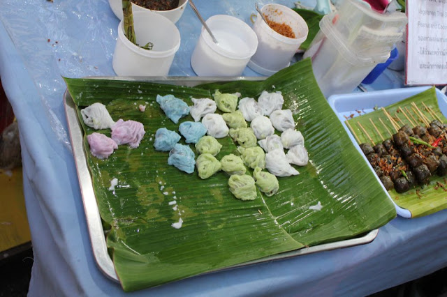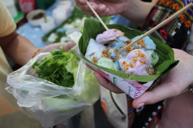 彩色餛飩是Khao kreab pak mor,皮是米做的,內餡是豬絞肉、花生和糖揉成的餡,