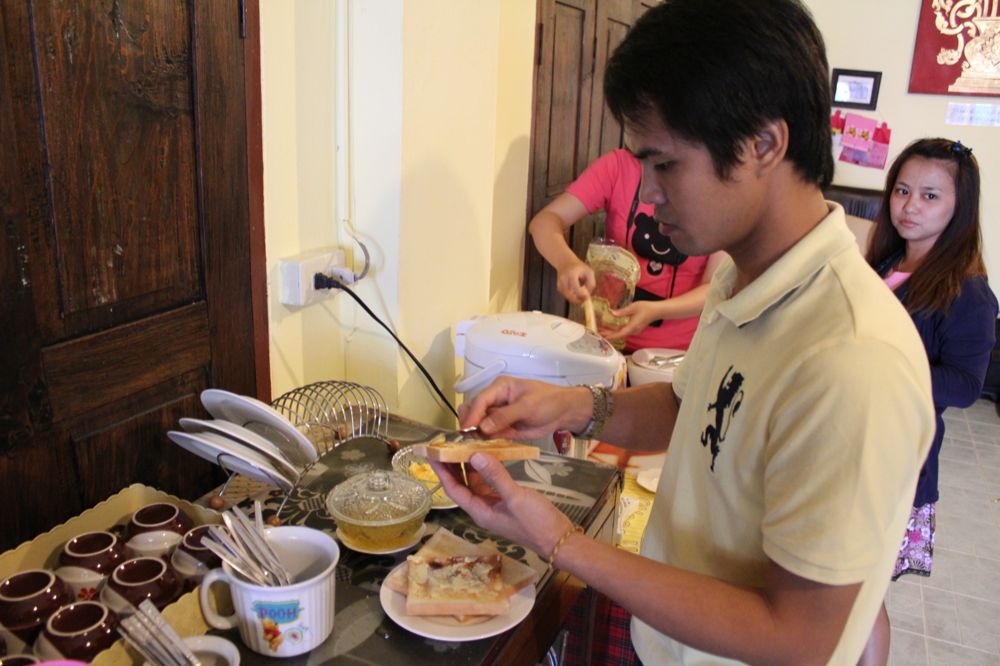 Golf在幫我們塗果醬,他身旁的門就是我們房間的入口