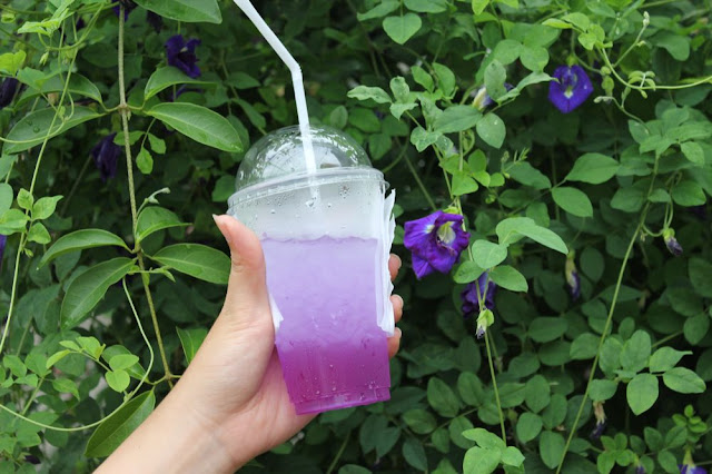 像我們就買了蝶豆花乾回來泡茶喝,也可加在飯裡煮變成紫色的飯,