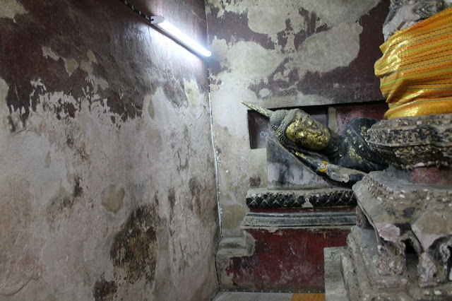 牆上的漆都斑駁了,中間有座小舍利塔,後方躺臥著一座臥佛。