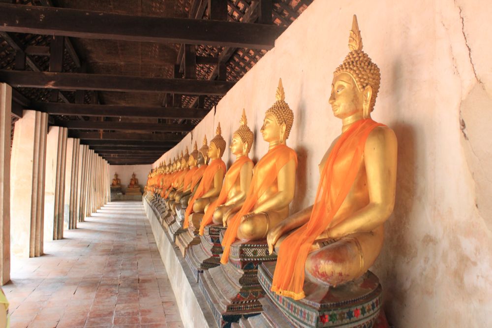 一穿越圍牆會看見整齊排列在牆邊屋簷下的佛像,每尊佛像都身穿金黃色袈裟,