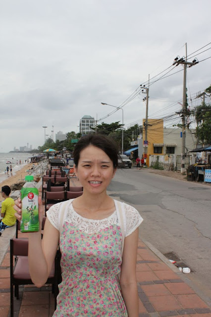 踏完浪上來,手上的是泰國很普遍的綠茶飲料,像台灣的純喫茶但非常甜 |