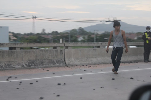 回程的路上看到內車道有砂石掉落,交通警察看著一名當地人在撿石頭。
