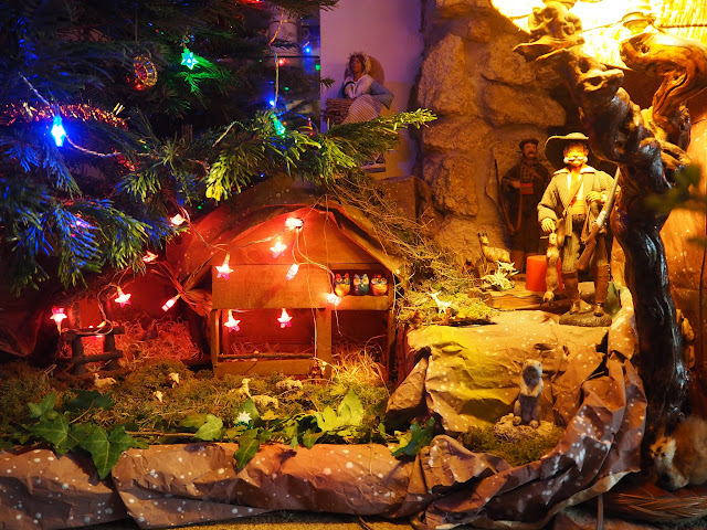 小佈景是親家親自裝飾的,小屋上還有小鳥,草地上有松鼠還有獵人、農婦等等 |