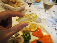 開胃菜煙燻生鮭魚佐檸檬以及干貝串,串干貝的是香茅的莖。