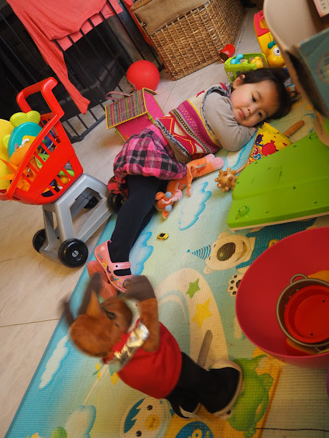 結果這兩歲半的小妞自己躲在角落邊玩邊掉淚,