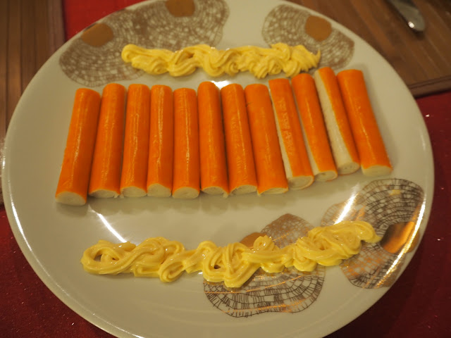 | 午餐的前菜蟹味棒與臘腸 |