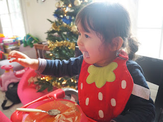 | 今天的桌巾是充滿喜氣的紅色,迎接新的一年 |