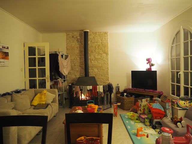| 冬天衣服不容易乾,火爐旁邊是曬衣服的好地方; 右邊是小川的遊樂區 |