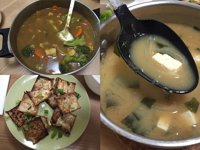 | 咖哩飯配乾煎百頁豆腐,湯品則是海帶豆腐味噌湯 |