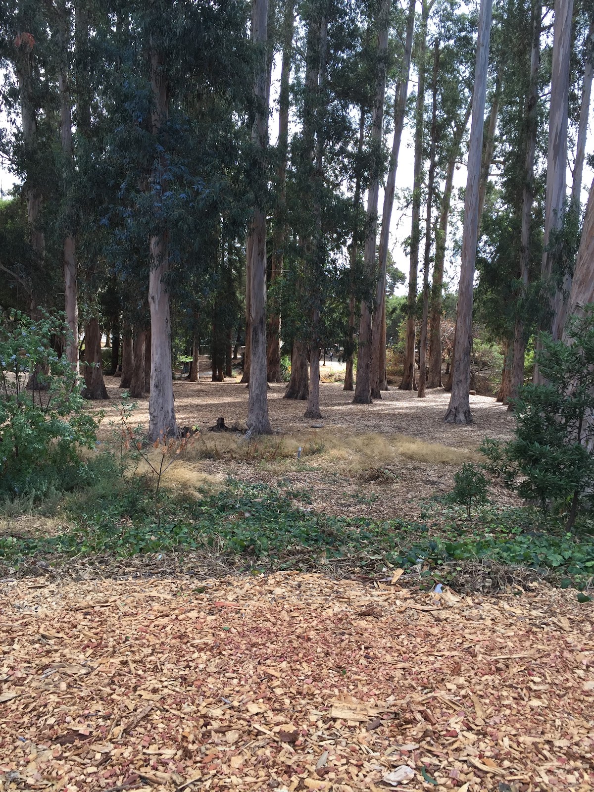 這片樹林屬自然生態區,在我們到訪前不久七月的時候,校方與FEMA美國聯邦緊急事務管理署曾打算耗資近2億台幣砍伐這些樹木,理由是尤加利樹容易造成火災,引發保育人士與市民的不滿而發起裸體護樹的行動。
