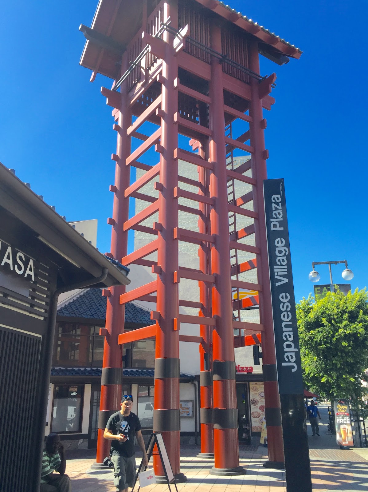 在日本村廣場的入口處矗立一座The Little Tokyo Watchtower小東京瞭望塔,