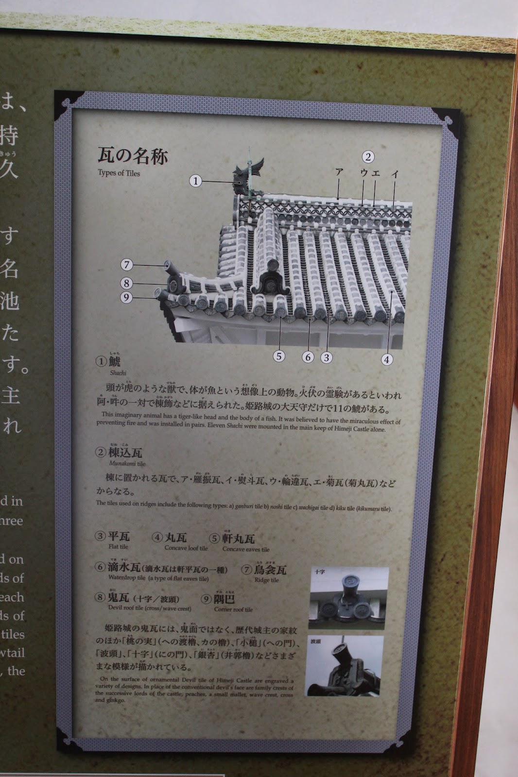 在每個城門屋簷上有獸頭瓦─「鯱」為一種想像的動物,虎頭魚身,不同時代的造型不同。