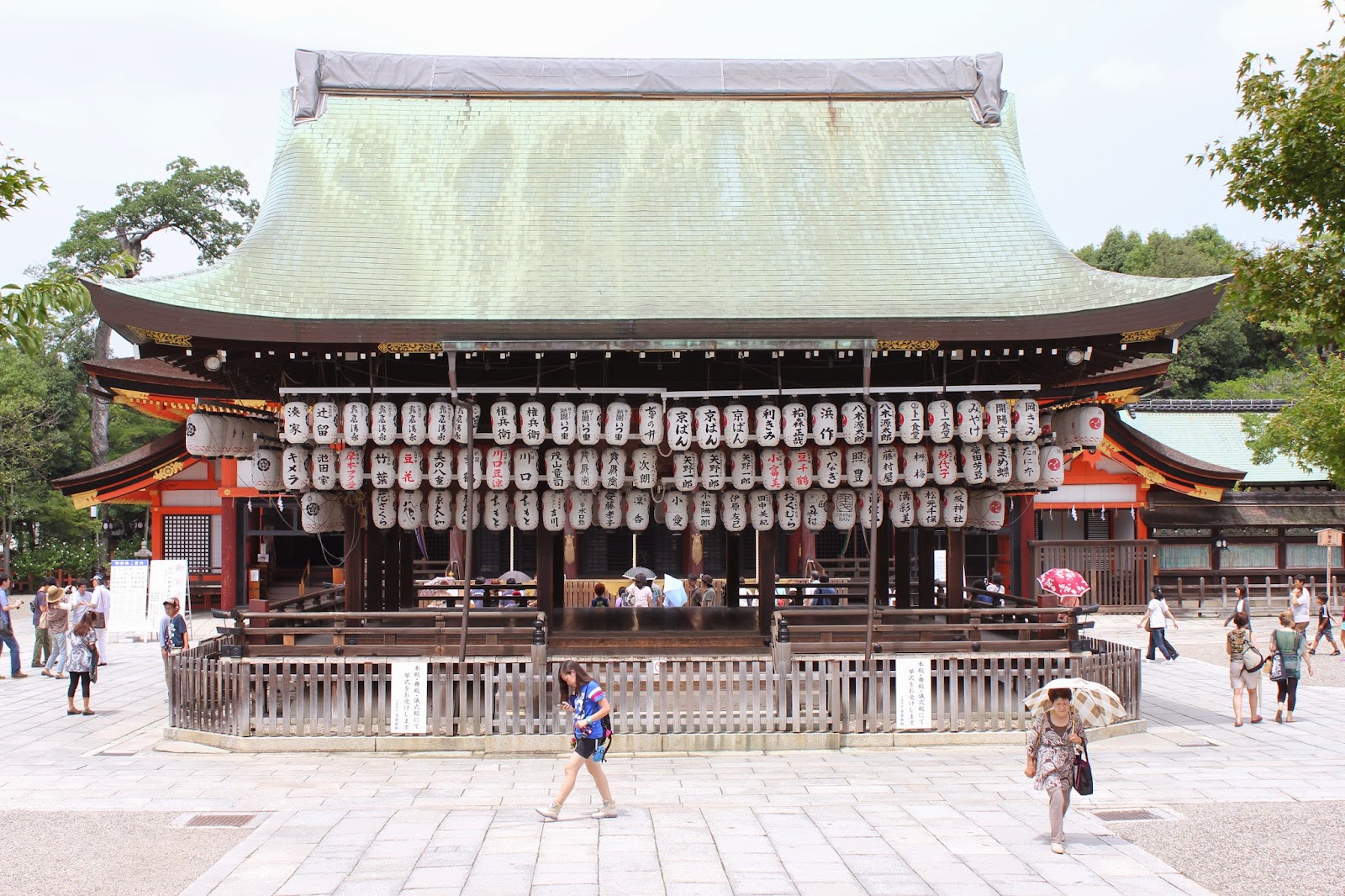 | 八坂神社可保佑生意興隆,舞殿下掛滿商家奉納的燈籠 |