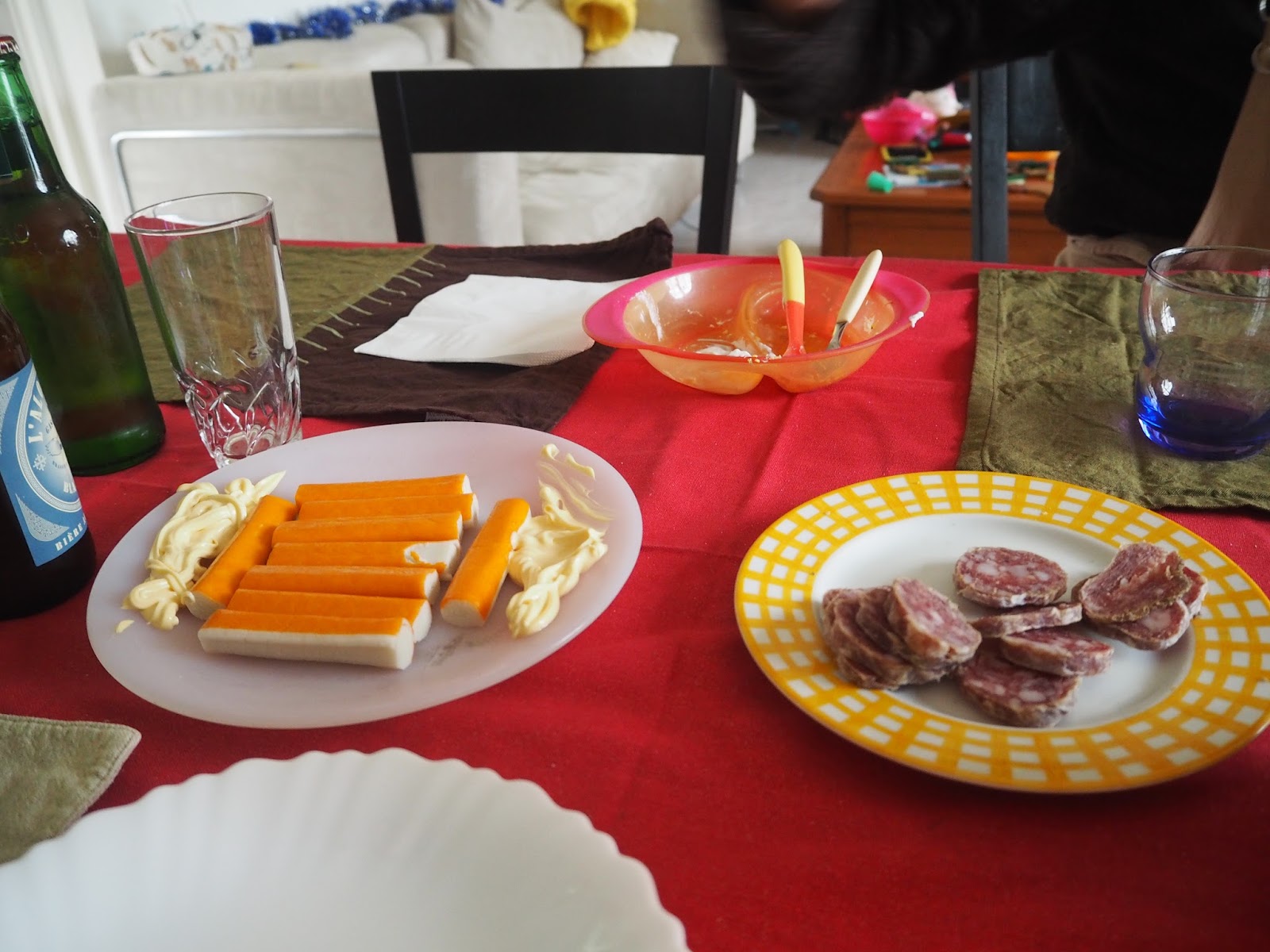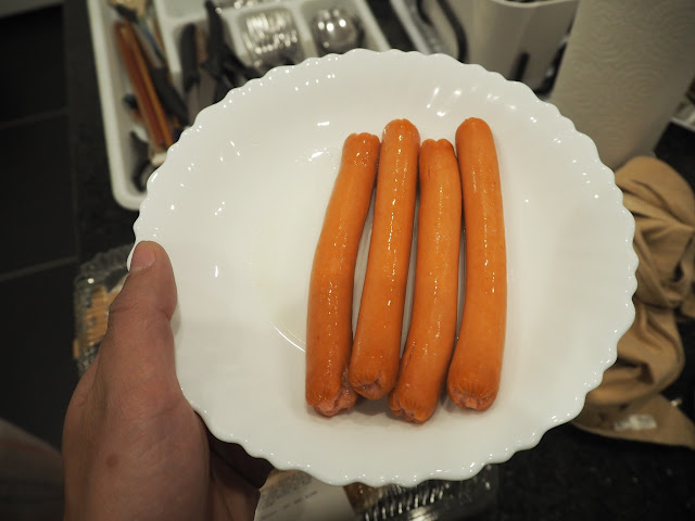 | 午餐的前菜蟹味棒與臘腸 |