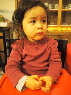 感謝老天爺終於可以吃飯了,小川被抓上餐桌椅準備先被餵飽。