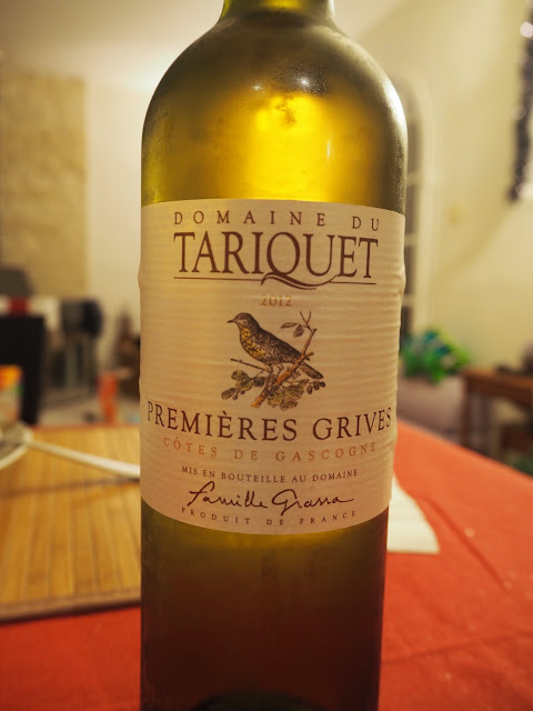 | 主菜配酒TARIQUET LES PREMIERES GRIVES 2012 產地在法國西南部的Côtes de gascogne加斯科涅,是生產白酒的區域 |